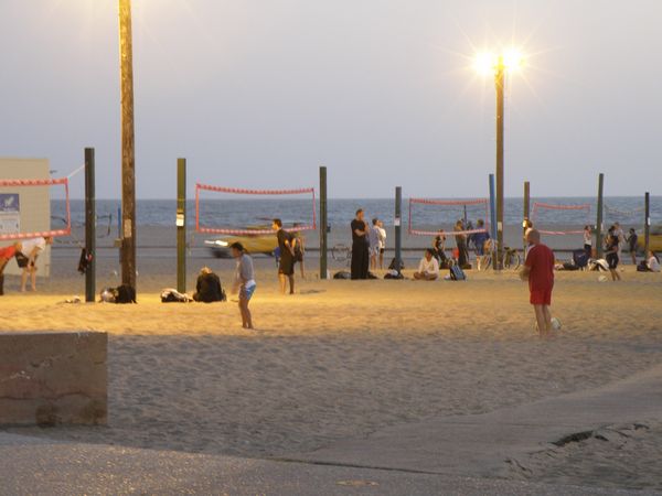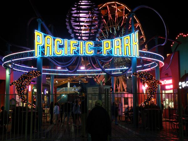 | Volley ball, played on the Santa Monica beach, was played well into the night. | Pacific Park rides on the Santa Monica Boardwalk. |