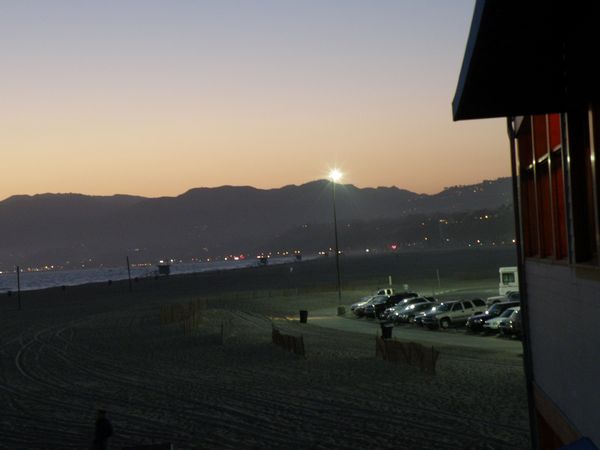 | Had to stop for Hush Pups and beer. To Deb's surprise, the Hush Pups had shrimp in them (Tilapia is as seafood as Deb gets). | Santa Monica Beach. Although taken just minutes before the next picture, the camera made this look lighter than it really was. |